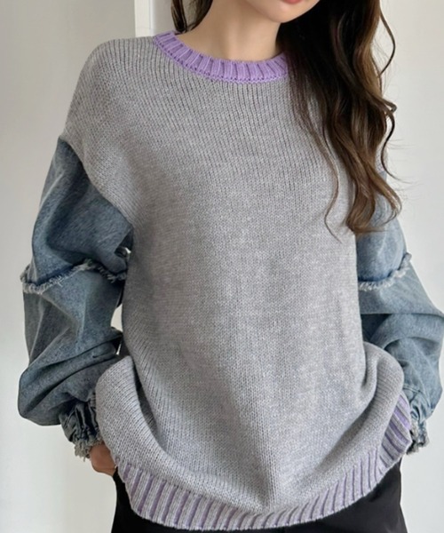 袖デニム配色ニットPOで異素材MIXスタイル【袖デニム×カラフル配色が目を引く個性派ニットプルオーバー】■商品の特徴袖にデニム生地を切り替えた異素材MIXデザイン。襟元と裾にカラフルな配色リブを施した遊び心のあるアイテムです。パープル、グリーン、イエロー、ピンクの全4色展開。■詳細説明本体はニット素材、袖部分にデニム生地を使用した異素材切替が個性的なプルオーバー。襟元と裾には本体とは異なるカラーのリブを配し、カラフルな配色デザインで遊び心をプラス。一枚でレイヤードスタイルを楽しめるデザイン性の高いアイテムです。ニット素材の優しい風合いとデニムの程よいハリ感のコントラストが絶妙で、カジュアルながらもトレンド感のある印象に。シンプルなボトムスと合わせるだけで、一気におしゃれ度がアップする頼れる一枚です。■生地・素材感透け感:なし伸縮性:あり生地の厚さ:普通生地の柔らかさ:やや柔らか裏地:なしポケット:なし■素材・混率情報本体 アクリル100%別布 綿100%■サイズ情報(cm)Mサイズ:着丈68 身幅60 肩幅58 袖丈51Lサイズ:着丈70 身幅62 肩幅60 袖丈52■コーディネートワイドパンツと合わせてリラックススタイル、デニムパンツと合わせてデニムオンデニム風スタイル、ティアードスカートと合わせてガーリーカジュアルなど、様々なボトムスとマッチします。足元はスニーカーでカジュアルに、ブーツでクールに決めるのもおすすめ。異素材切替と配色デザインが主役となるので、ボトムスはシンプルにまとめることでバランスの良いスタイリングが完成します。カラフルな配色が顔周りを明るく見せてくれる効果も期待できる、おしゃれな一枚です。【STAFF着用コメント】目を引く配色ニットで、袖がデニムになっていてさらに個性的!デニムがニットに合うから他のアイテムを邪魔せず、デニム部分は柔らかくて厚すぎないからアウターにも響きにくい。袖がクシュっとしていてさりげなくおしゃれ◎(152cm・普通体型・Mサイズ着用)■お気に入り登録★《お気に入り登録》でお得な情報がいっぱい★・「商品のお気に入り登録」で再入荷通知や、ラストの通知、セール通知も受け取ることができます・「ブランドのお気に入り登録」で新商品や再入荷など、お得な情報を受け取ることができます!※商品画像は撮影時の光や角度により、実物の色味と異なって見える場合がございます※撮影はサンプル品を使用しており、表示のサイズ感も実物とは若干異なる場合もございますので、予めご了承ください※生産時期により色・素材・サイズ感など多少異なる場合がございます。予めご了承ください※他のキャンペーンにより、期間中に価格が変動する場合があります※セールは予告なく終了させていただく場合もあります