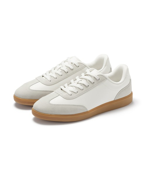 クッション性のあるインソールを使用。素材コンビのスニーカーです。甲部に使用した合成皮革の基材(下層)には、再生素材を使っています。※22.0cm~25.0cmはこちらからご覧いただけます。【おすすめポイント】・やわらかくクッション性の高いインソール(中敷)を採用し、歩行時の足の負担を軽減した履き心地の良さが特長です。・アッパー部分は本革と合革を組み合わせた仕様で、同系色でまとめながら素材感・表面感の異なる切り返しがアクセントになっています。・クリーンにもカジュアルにも合わせやすく、幅広いコーディネートに合わせやすい汎用性の高さも特長です。・長く履き続けると摩擦で擦れやすいつま先やかかと部分に本革を使用することで、より長く履いていただける仕様を採用しました。お取扱い上のご注意 : ●濡れた床、路面ではシューズが滑ることがあります。十分ご注意ください。●かゆみやかぶれなど異常を感じたら、すぐに使用を中止してください。●変形、軟化のおそれがありますので、火の側などに置くことはお避けください。●油をひいてある場所での使用はなるべくお避けください。●お子様が使用の際は、保護者の方がご注意ください。お取扱い上のご注意2 : ●革の汚れはブラシで落とし、水洗いはお避けください。お取扱い上のご注意3 : ●濡れた場合は乾いた布ですぐに拭き取り、風通しのよい場所で、陰干ししてください。お取扱い上のご注意4 : ●靴は目的に合わせて選び、本来の用途以外でのご使用はお避けください。転倒など思わぬ怪我の原因となります。お取扱い上のご注意5 : ●この製品はウレタン樹脂を使用しており、湿気により劣化する性質があり、保管状況によっては劣化することがありますのでご了承ください。●なるべく温度湿度が低く、風通しの良い場所に保管してください。お取扱い上のご注意6 : ●この製品は表面を起毛しているため、毛羽が倒れて白っぽく見えることがあります。●水に濡れるとシミになることがあります。また、衣服などとの摩擦により革部へ色移りする場合がありますのでご注意ください。●毛羽が衣服についた場合は、ブラシなどで落としてください。