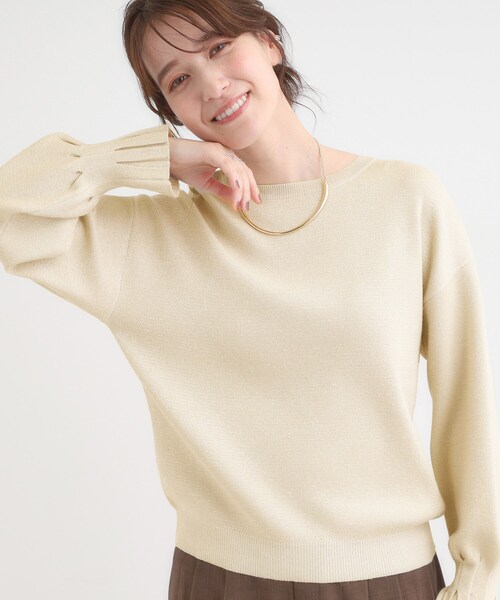 【デザイン】ラメ感が華やかさをプラスしてくれるニット。シンプルなシルエットながら、お袖口のタックディテールがポイントになり、女性らしさを演出。柔らかな肌ざわりで着心地も良いです。【スタイリング】フレアスカートやプリーツスカートと好相性。1枚着るだけでフェミニンな着こなしが完成します。デニムやワイドパンツと合わせていただくと、カジュアルな中に品のある大人スタイルに。アクセいらずで華やぐ1枚は、デイリーにもお出かけにも重宝します。【お客様からいただいたコメント】・綺麗なラベンダーカラーです。 袖口が素敵です。 優しい色合いでラメが入っているので全体的にオシャレ感が増します。 パンツにもスカートにもどちらでも合うと思います。 グレー系やベージュ系ブラック系ホワイト系などの色合わせが素敵だと思います。 1枚でも着られますし、アクセサリーなどでアクセントをつけて楽しめる1着です。 (身長:160cm 体型:普通 ラべンダーのMサイズ購入)・思ったよりラメがキラキラしていて可愛いです。 色も素敵で何にでも合わせやすいと思います。 (身長:155cm 体型:普通 ラベンダーのSサイズ購入)・キラキラです。しっとりした感触で着やすいです。 (身長:157cm 体型:普通 ラベンダーのLサイズ購入) とのお声を頂戴しております。【素材】ラメ混のサラッとした素材を使用しています。※照明の関係により、実際よりも色味が違って見える場合があります。また、パソコン・スマートフォンなどの環境により、若干製品と画像のカラーが異なる場合もございます。モデル情報:身長166cm B80 W59 H85 着用サイズ:02(M)店舗へのお問い合わせ商品番号:741-14024●製品寸法:01(S):着丈51cm B92cm 袖丈45cm 肩幅47cm02(M):着丈53cm B96cm 袖丈46cm 肩幅48cm03(L):着丈55cm B100cm 袖丈46cm 肩幅49cm04(LL):着丈56cm B104cm 袖丈47cm 肩幅51cm備考: