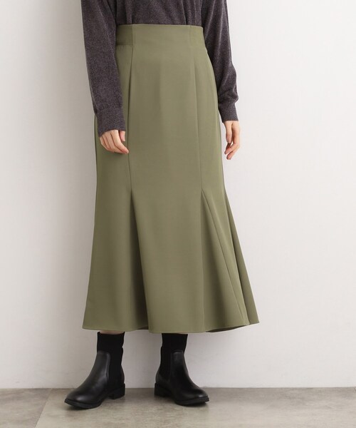 女性らしさと心地よさを両立。動きに表情が生まれる、しなやかマーメイドスカート。【デザイン】6枚接ぎの立体設計に、裾マチを加えた、動きに優しく揺れるマーメイドラインスカート。腰周りはすっきりとフィットしながら、裾にかけて広がる自然なラインが美しいシルエットを描きます。両脇のウエスト部分にはリブ素材を切り替え、見た目を損なわずに柔らかな伸縮性をプラス。締め付け感が少なく、快適な着心地に仕上げています。異素材の切り替えデザインがアクセントになり、さりげなくウエスト周りをシャープに見せてくれる効果も。【素材】落ち感のあるポリエステル混の合繊素材を使用。動きに合わせてしなやかに揺れる質感が女性らしさを引き立て、シルエットをよりきれいに見せてくれます。さらりとしたタッチで肌離れも良く、暑い時期にも快適。シワになりにくく、お手入れのしやすさも魅力です。【スタイリング】コンパクトなトップスを合わせてマーメイドシルエットを引き立てるのはもちろん、オーバーサイズのニットやシャツを合わせて裾の揺れ感だけを活かしたスタイリングもおすすめ。足元はパンプスで上品に、スニーカーでカジュアルダウンしても◎。オフィスにもデイリーにも馴染む、着回し力の高い一枚です。【仕様】・ポケットなし・左脇ファスナー・ウエスト後ろゴム・膝丈の裏地あり※照明の関係により、実際よりも色味が違って見える場合があります。また、パソコン・スマートフォンなどの環境により、若干製品と画像のカラーが異なる場合もございます。【25AW】モデル情報:身長166cm B80 W59 H86 着用サイズ:02(M)店舗へのお問い合わせ商品番号:768-74019●製品寸法:01(S):W63~77cm H95cm 総丈86cm02(M):W66~80cm H98cm 総丈88cm03(L):W69~83cm H101cm 総丈90cm04(LL):W72~86cm H104cm 総丈92cm05(3L):W75~89cm H107cm 総丈92cm備考: