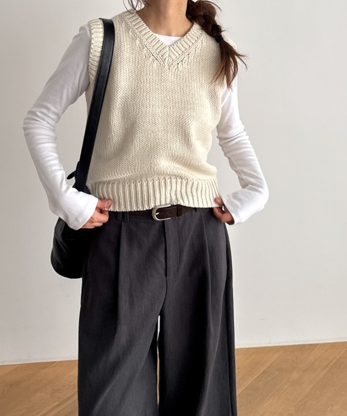 デザイン 首元はVネックで、顔周りをスッキリ見せてくれるニットベスト。 やや短めの丈感なのでバランスが取りやすいのも嬉しいポイントです。 素材 ウール混素材で保温性があり、冬でも暖かく着ていただけます。 コーディネート シャツやロンTなど、様々なトップスとのレイヤードスタイルが楽しめる1枚。 合わせるインナー次第でロングシーズンお使いいただけます。 El mar(エルマール) El mar はスペイン語で『海』 海に向かうときはだれでもワクワクする。 洋服を選ぶとき、袖を通すとき、 同じように心が踊るアイテムを提案したい。 そんな『ワクワク』な気持ちを込めて El mar はデビューしました。 ------------------------------------- 生地の厚さ:厚い〇〇●〇〇薄い 伸縮性:あり 透け感:なし 裏地:なし 光沢:なし ------------------------------------- 【ニットのお手入れ方法について】 ニットの風合いを損なわず、きれいに保ち続けるためには日頃のケアが必要です。 1日着用して湿気がこもったニットは、風通し良い場所に干し湿気を取り2-3日お休みさせてください。 型崩れさせないようにするために畳んで保管するのがおすすめです。 ハンガーで保管の場合は、肩線が崩れないように厚みのあるハンガーや木製ハンガーをご使用ください。 【毛玉のケア方法】 毛玉取り器を使い、優しく回しながら取り除いてください。 毛玉が大きいものや毛足の長いものは、毛玉をつまみハサミでカットするのがおすすめです。 取扱い ・おしゃれ着洗剤をご使用ください。 ・クリーニングネットをご使用ください。 ・濃い色と白 ・淡色物は分けて洗ってください。 ・素材の特性上、摩擦に弱く特に湿潤時に受ける摩擦は変色や白化の原因となります。 ・脱水機は使用せずに、軽く押し洗いをし、タオルを挟んで水分を取り、形を整えて陰干ししてください。 ・洗濯で多少縮むことがあります。洗濯後はすばやく形を整えて干してください。タンブラー乾燥はお避けください。 ・アイロンの際は当て布をご使用ください。 ・着用時の汗や摩擦により、他の衣類や鞄などに色移りすることがありますので、淡色系との着合わせはご注意ください。 ・摩擦や引っかけにご留意ください。 ※取り扱い及びお手入れ方法については、商品についている取扱表示、洗濯表示にてご確認下さい。 ※照明の関係により、実際よりも色味が違って見える場合があります。またパソコン・スマートフォンなどの環境により、若干製品と画像のカラーが異なる場合もございます。 ※商品の色味は、商品アップ画像をご参照ください。