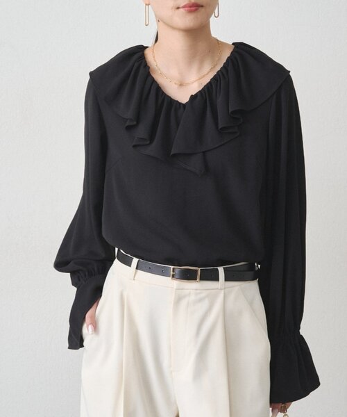 顔まわりを華やかに彩る、繊細なフリルが印象的なブラウス。 ■デザイン 繊細なしぼ感が特徴のジョーゼット生地を使用したブラウス。 ソフトなシアー感なので、そこまで透け感は気になりません。 落ち感もある生地なので、フリルデザインではありますが、ボリュームはありつつも落ちつきがあります。 ゴムの入ったキャンデースリーブなので、袖をたくし上げやすいです。 ■コーディネート カジュアルなデニムとの相性はもちろん、きれいめなスカートやパンツと合わせれば、オフィススタイルにも活躍します。 普段使いはもちろん、ちょっとしたお出かけや、特別な日の装いにも。 一枚で着映えするブラウスは、ワードローブにあると重宝すること間違いなし。 ■素材・洗濯表示 素材:ポリエステル100% 洗濯表記:手洗い可 【お気に入り登録でお得な情報をお知らせいたします 】 完売カラーの再入荷やラスト1点の通知、セールの通知を受けとることができます。 【ブランドのお気に入り登録】 新商品や再入荷、いち早くセールやクーポンなどのブランドの情報を受けとることができます。 生産の都合上、お届け時期が前後する場合がございます。 システムの都合上、店舗より入荷が遅れる場合がございます。 実際にお届けする商品と仕様やサイズが異なる場合がございます。 照明や光の当たり具合で色味が違って見える場合があります。