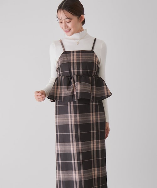 【デザイン・シルエット】 ・トップスのペプラムデザインが、気になるウエスト周りを自然にカバー。 ・キャミソールデザインのトップス部分がデコルテを美しく見せ、すっきりとした印象に。 ・タイトすぎないIラインシルエットのスカートで、エレガントな着こなしが楽しめます。 ・バックスタイルは深めのスリット入りで足捌きが良く、抜け感をプラスします。 ・肩ひもの長さはアジャスターで調節可能、自分にぴったりの丈感に。 ・秋冬のお洒落をアップデートする一枚です。 【素材感】 ・柔らかく、肌触りの良い千鳥格子柄の起毛素材。 ・ほどよい厚みがあり、身体のラインを拾いにくいのが魅力。 ・マシンウォッシャブルなのでご自宅でのお手入れも楽ちんです。 【カラー】 02 クロ 07 グレー 22 チャイロ 【スタイリングポイント】 ・インナーにタートルネックを合わせると、秋冬らしいレイヤードスタイルが楽しめます。 ・シアー素材のインナーを合わせてトレンド感のある異素材ミックスコーデを楽しむのもおすすめ。 ・寒い季節には、ロングコートやカーディガンを羽織って、上品にまとめて。 ・パンプスやショートブーツを合わせるだけで、上品なスタイルが完成。 ・スニーカーでカジュアルダウンさせれば、抜け感のあるスタイルも楽しめます。 裏地:なし 光沢感:なし 透け感:なし ポケット:なし 伸縮性:あり 生地の厚さ:普通 ボタン:なし その他仕様:肩紐調節 季節:秋冬 ※撮影時の光、お使いのモニター環境によって色の見え方が違う場合がございます。予めご了承ください モデル身長:167cm 着用サイズ:M