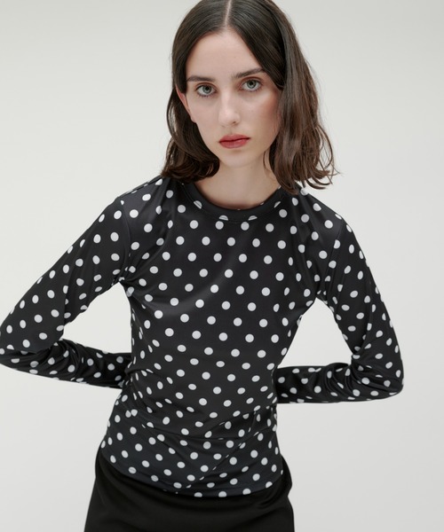 【スリーク ドット トップス】程よく存在感のあるドット柄がモードな雰囲気のカットソートップス。シンプルながらもさりげない切り替えが入っている遊び心のあるデザインです。スリークな肌触りで気持ちよくフィットする素材。大きめのドットプリントは1枚で着てコーディネートの主役に。スタイリングのアクセントにもなり、ジャケットを合わるとモードにまとまります。#KTWR47素材: ポリエステル95% ポリウレタン5%サイズF 丈60cm 肩巾35cm バスト80cm 袖丈62cm― 備考 ―伸縮性:あり透け感:チュール部分あり リブ部分 カラーによってややあり生地の厚さ:薄い 〇〇●〇〇 厚い洗濯:可 ウエットクリーニング:可ー Attention ー※お届け予定時期は変更となる場合がございます。あらかじめご了承下さいませ。※商品のお色味は、お使いのバイスや撮影時の照明等により、実物と若干異なって見える場合がございます。また、撮影ではサンプルを使用しておりますため、実物の商品と若干サイズ感や仕様が異なる場合がございます。※お取り扱いにつきましては、品質表示とアテンションタグを必ずご確認下さいませ。【kiehtova -キエトバ-】無駄のないミニマルな様式美をコンセプトに、いつまでも美しく身につけられる実用性を追求したデザインシンプルなコーディネートを格上げするこだわりのジュエリーなど芯の強い女性のトータルコーディネートを提案します<H.O.V -フォブ->WE'RE ON A MISSION OFMINDFUL CONSUMPTION あらゆるライフステージにおいて芯から必要とされるものをお届けすることが私たちのミッションと考えます。 身に付ければ心が満たされる様な美しいデザインとは何かを日々想像しています。良い素材を選び熟練の職人技術を尊び慎重な生産を行っています。そうすることで長く着用して 愛されるものを創り出し、購入後の商品のセカンドライフも提供したいと考えています。