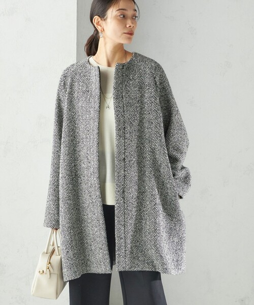 ―25AW―生地の中に織り込まれたスパンコールが上品な印象を与えてくれるノーカラーコート■デザイン優しい雰囲気のAラインシルエットのウールコート。フェイス周りを綺麗に見せてくれるクルーネックと、肩周りが華奢な印象を与えるラグランスリーブがデザインポイントになっています。袖口にダーツを入れ丸みを持たせることで、立体的なフォルム表現しています。フロントはホック仕様ですっきりと、スタイリングバランスがとりやすくいひざ下丈に仕上げました。■素材ざっくりとしたウールの糸にスパンコールを絡ませたイタリアのラトーレ社の素材を使用しています。ヘリンボーン組織のミックスカラーにさりげなくスパンコールが施された上質な素材感です。■スタイリングオフィススタイルからお食事会やパーティーシーンまで幅広く着用していただける女性らしいコートです。ひざ下丈なのでワンピースはもちろん、パンツもスカートもシルエットを選ばず合わせていただけます。ゆったりしていますが品の良い印象で綺麗めなスタイルにおすすめな1枚です。■お問い合わせ品番:314-17-0016▼シリーズもございます。Pure SUPER100 ノーカラー コート(品番:314-17-0015)-------------------------------------生地の厚み:中間伸縮性:有透け感:無光沢感:スパンコール部分有ポケット:有手洗い:手洗い不可-------------------------------------※摩擦により毛羽立ちや毛玉が生じやすいため、連続着用はお避けください。※毛玉が生じた場合は、毛玉取り器等で除去してください。※こちらの商品は素材の特質上、引っかけや引っ掛かりが起きることがあります。着用の際はバッグやベルト、アクセサリー、壁など表面の粗いものとの連続しての接触や、摩擦、お取り扱いに十分お気を付けください。※この製品に使用しているスパンコールやビーズは、非常にデリケートです。引っかかりや継続的な摩擦には十分ご注意ください。また人体、皮膚への引っかかりによりケガに繋がる危険性もございますので、十分にご注意ください。※過度な力や摩擦が加わると、縫い目の滑脱、生地の擦り切れや破れ、生地の変形が生じますので十分にご注意ください。※撮影環境により商品の色味が異なって見える場合がございます。商品のお色味は、物撮り画像をご参考にしてください。※末永く愛用頂く為に、アテンションタグを必ずご確認の上、着用又はお取り扱いください。※画像の商品はサンプルです。 実際の商品と仕様、加工、サイズが若干異なる場合がございます。