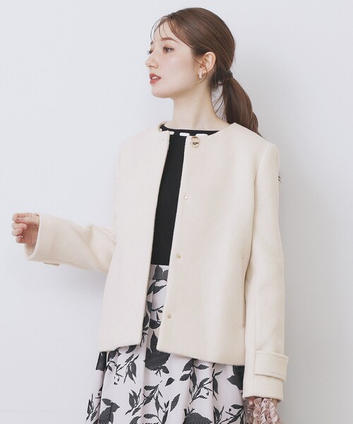 毛足のある上品な光沢感と素材感を活かしたノーカラーショートコート 【デザイン】 ・羊毛とカシミヤをブレンドした良質な素材感が、暖かさと上品感を兼ね備えた一着。 ・ノーカラーのすっきりとしたデザインが、顔周りを上品に引き立て、インナーとのレイヤードも楽しめます。 ・変形ゴールドボタンがアクセントとなり、シンプルな中に華やかさをプラス。 ・センターバックにはタックを入れ、動きやすさと立体感を両立。後ろ姿にもこだわったデザインです。 ・隠しドットボタンも小さくゴールドで統一され、細部まで上品な仕上がりに。 ・どんなスタイリングにも合わせやすい丈感です。 【素材】 ・羊毛とカシミヤをブレンドしたビーバーモッサ素材が、柔らかく滑らかな肌触りと保温性を提供します。 ・比較的軽量でありながら暖かく、長時間の着用でも快適な着心地を実現。 ・良質な素材感が、シンプルなデザインを格上げし、特別感のある仕上がりに。 【仕様】 ・ポケット数:横×2 ・裏地あり ※照明の関係により、実際よりも色味が違って見える場合があります。また、パソコン・スマートフォンなどの環境により、若干製品と画像のカラーが異なる場合もございます。 モデル情報:身長163cm B81 W56 H82 着用サイズ:38(M) 店舗へのお問い合わせ商品番号:C58-94004 ●製品寸法: 34(XS):着丈56cm B100cm 袖丈56cm 肩幅36cm 36(S):着丈57cm B102cm 袖丈58cm 肩幅37cm 38(M):着丈58cm B104cm 袖丈60cm 肩幅38cm 40(L):着丈58cm B105cm 袖丈61cm 肩幅39cm 42(LL):着丈59cm B106cm 袖丈62cm 肩幅40cm 備考:重量:38(M)約810g
