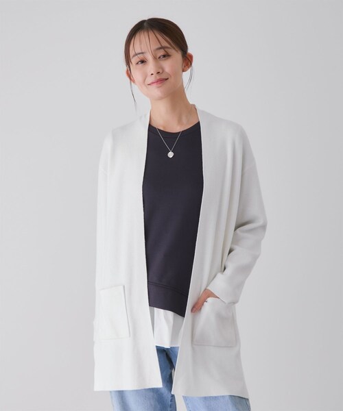 【デザイン・シルエット】 ・身体のラインを拾わない、ゆったりとしたオーバーサイズシルエットです。 ・ハイゲージの編み地が、すっきりと見せてくれます。 ・程よいドロップショルダーで肩まわりに丸みが生まれ、女性らしい柔らかな印象に。 ・大きめのポケットが、デザインのアクセントと機能性を両立しています。 ・ヒップが隠れる丈感で体型カバーもバッチリ◎ ・さっと羽織るだけで、こなれた大人のリラックススタイルが完成します。 【素材感】 ・もちもちとした肌触りが特徴のニット素材。 ・滑らかで肌触りが良く、快適な着こなしが叶います。 ・手洗い可能でご自宅でのお手入れが楽ちんです。 【カラー】 01 クロメイン 07 グレー 11 シロサブ 27 ベージュ 40 コンメイン 【スタイリングポイント】 ・Tシャツやブラウスに羽織るだけで、いつものスタイルがワンランクアップ。 ・細身のパンツやタイトスカートと合わせれば、メリハリのあるスタイルが完成します。 ・ワンピースに合わせれば、フェミニンな雰囲気をプラスできます。 ・同系色のアイテムと合わせて、ワントーンコーデを楽しむのもおすすめです。 ・足元はヒールやブーツで大人っぽく、スニーカーでカジュアルダウンするのも◎。 裏地:なし 光沢感:なし 透け感:シロややあり ポケット:あり 伸縮性:あり 生地の厚さ:普通 ボタン:なし その他仕様:なし 季節:春秋冬 ※撮影時の光、お使いのモニター環境によって色の見え方が違う場合がございます。予めご了承ください。 モデル身長:167cm 着用サイズ:M