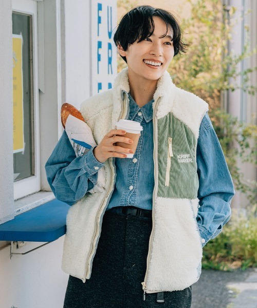 《KRIFF MAYER 秋冬アイテム「シャギーボアベスト」》KRIFF MAYER人気のシャギーボアシリーズ!2色の糸をミックスさせた杢感のある柔らかな見た目に、ボリューム満点の毛足が特徴の素材です。 フワッとした暖かな着心地を重視し、カット素材の裏地にもこだわりました!ベストは羽織ってみると予想以上に暖かく、腕周りも動かしやすく利便性も◎擦れやすい脇は綿素材で切り替えて毛玉ができにくいようにしつつ、ボリュームを抑えてすっきりとした見た目に仕上げています。 レイヤードが基本のアイテムなので合わせやすいように強い色を入れず、柔らかな色でまとめて着回しやすく工夫しました♪ 同コンセプトのメンズアイテム(品番:2514402)・犬服(品番:D2514405)の展開もあり、お揃いでの着用もお楽しみいただけます!-------------------------シルエット:スタンダード生地の厚さ:普通透け感:なし伸縮性:ややあり裏地:ありケア方法:洗濯機洗い可(ネット使用)-------------------------●KRIFF MAYER(クリフメイヤー)家族みんなの毎日に楽しさと笑顔をお届けしたい。クリフメイヤーの服にはそんな思いがたくさん詰め込まれています。メンズ・レディース・キッズ、更にドッグウェアまで展開。何気ない日々が特別な思い出に変わる瞬間を演出する、ベーシックかつオリジナリティーあふれる新しいデイリーウエアを提案します。