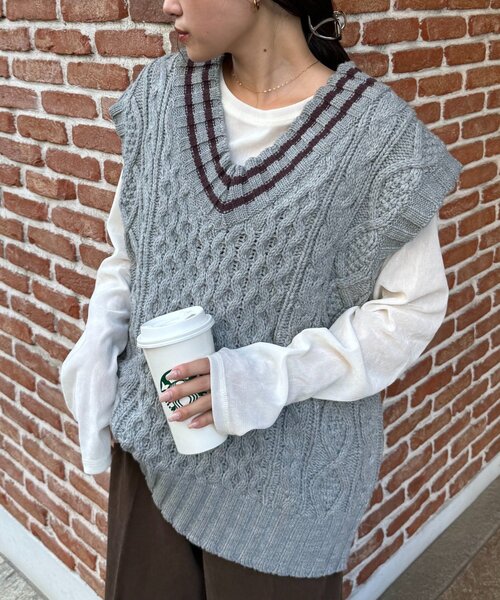 ゆるっと華奢見え! シーズンムード高まるケーブル編みニットベスト ■デザイン クラシックな雰囲気漂うVネックにラインのデザインを、 オーバーサイズシルエットで今っぽく仕上げたニットベスト。 おしりが隠れるほどの長め丈と、肩が落ちるフォルムが抜け感や華奢見えを演出します♩ ランダムなケーブル編みが表情をプラス、シンプルながらデザインの効いた印象に。 シャツやロンTと合わせるだけで、秋冬のレイヤードが完成◎ ふっくら編み上げた生地感でご自宅で手洗い可能なのも嬉しいポイント! ■スタイリング シャツに重ねるだけで王道スタイル完成。 ロンTやスウェットなどカジュアルな雰囲気にも馴染む万能デザインです! ミニスカート・ショートパンツと合わせてワンピース風に着こなすのも可愛らしく、 ミドルかロングのブーツでさらにバランスアップ。 デニムやワイドパンツと合わせればカジュアルに、スラックスならきれいめにも対応できる着回し力抜群のベストです。 ■お手入れ方法 洗濯:液温は40 ℃を限度とし、手洗いができる アイロン:底面温度120 ℃を限度としてアイロン仕上げができる タンブル乾燥:不可 ・・・・・・・・・・・・・・・・・・・・・・ 透け感:なし 裏地:なし 伸縮性:ややあり 光沢感:なし 生地の厚さ:普通 ・・・・・・・・・・・・・・・・・・・・・・ ▼気になる商品をお気に入り登録 ♡をクリックして《お気に入り登録》がオススメです! 入荷情報や、クーポン情報が通知されるようになります。 ※画像の商品はサンプルを使用しております。実際の商品と若干の仕様が変更になる場合がございますので、予めご了承の上ご注文くださいますようお願いいたします ※屋外の光や照明の当たり具合で、実際の商品の色味とカラー別画像の色味に若干の違いが発生する場合がございます。詳細画像と併せてご確認の上、ご注文いただきますようお願い致します。 ※独自のタイムセールなどの施策により、実店舗と価格差が発生する場合がございます。 ※実際の店舗在庫につきましては、各店舗に直接お問い合わせください。