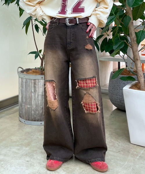 チラ見えする柄で差をつける主役級デニム▼ポイント大胆なダメージ加工が目を引くワイドデニム。ギンガムチェックやドット柄を組み合わせたパッチワークで、ヴィンテージライクな風合いと遊び心をプラスしました。ルーズなシルエットがリラックス感のある着こなしを叶えます。ウエストは二段階のボタンで調整でき、トップスや気分に合わせてサイズ感を自在にアレンジ可能です。▼スタイリングレースやフリルなど甘めなトップスと合わせ、ミックス感を楽しむのがおすすめ。厚底シューズを合わせて、ボトムスのボリュームを活かしたストリートライクな着こなしに。---------------------------------------------------透け感:なし伸縮性:なし裏地:なし光沢:なし---------------------------------------------------家庭洗濯:30℃限度/洗濯機[非常に弱い]タンブル乾燥:不可アイロン:低温110℃までクリーニング:ドライクリーニング不可、非常に弱い処理によるウェットクリーニング可●この製品は特殊な加工を施しており、一点毎に色合いが異なります。また洗濯の繰り返しにより色落ちし、独特な風合いの変化を射楽しみ頂けます。ほかの衣類等に色移りしやすいのでご注意ください。---------------------------------------------------※着用、お取り扱いの際は、商品についている品質表示とアテンションタグを必ずご確認下さい。※画像の商品はサンプルです。実際の商品と仕様、加工、サイズが若干異なる場合がございます。※可能な限り実物に近いカラーにて掲載していますが、撮影環境やモニター環境などにより製品と画像のカラーがやや異なって見える場合もございます。予めご了承ください。【お買いものをよりお楽しみいただく為に!!】▼商品のお気に入り登録(ハートマークをクリック)お気に入りアイテムの完売カラーの再入荷通知や、ラスト1点の通知、セールの通知も受け取ることができます。▼ブランドのお気に入り登録新商品や再入荷、クーポン配布などのお得な情報を受け取ることができます。
