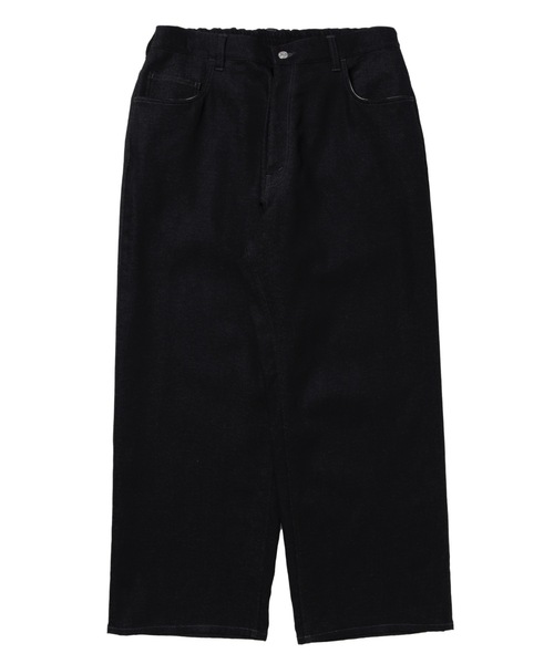 ・経糸、緯糸を通常のデニムの糸使いでドビー織機によって織り上げたオリジナルファブリックをリジッドで使用。・裏糸はループ調でふんわりとしたタッチを持つ。 ・バックゴムイージー仕様。前開き有り。 ・ワイドシルエット。