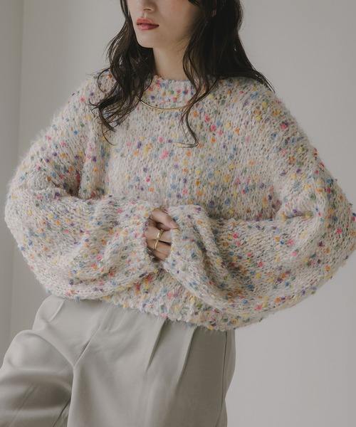 【ミックスの編地が目を惹くニットトップス】 表面を起毛させふんわりとしたエアリーな素材感のニット。ぽこぽことしたポップコーンがミックス配色になっています。 たっぷりとした身巾と程よいクロップド丈のバランスが◎ 袖口に向かってふんわと軽く膨らんだ袖が女性らしいニュアンスを演出。 カジュアルシーンや幅広いコーディネートに映える1枚です。 ≪備考≫ 伸縮性:あり 透け感:なし 生地の厚さ:厚手 肌ざわり:柔らかい 手洗い:可 ドライクリーニング:可 【インフォメーション】▼商品のお気に入り登録 完売カラーの再入荷通知を受け取ることができます。ぜひご登録ください★ ▼ブランドのお気に入り登録 新商品や再入荷などのお得情報を受け取ることができます。ぜひご登録ください♪