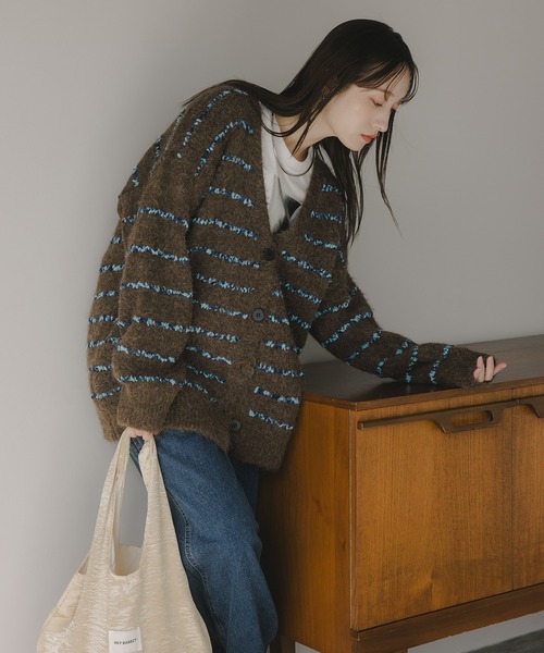 【トレンドライクなボーダーとシーズンらしいふんわりとした起毛感が映えるニットカーディガン】 ツイード編みで施した存在感のある配色ボーダーはコーディネートに取り入れるだけでトレンド感を演出。 カジュアルなサイズ感をベースにしつつ、起毛感のある素材が女性らしい柔らかさと優しいニュアンスをプラスします◎ 心地よい肌ざわりと軽やかな着心地で、シーズンムードを高めてくれるオーバーサイズニットです。 カジュアルなボーダーデザインにソリッドな色合いを組み合わせ、大人っぽく着こなせるカラーリングが魅力の起毛ニット。 ふんわりと柔らかく触り心地の良い素材を使用。 チクチク感の少ない滑らかな肌触りで程よい厚みながら軽やかにご着用いただけます◎ ------------ 裏地 なし 透け感 なし 伸縮性 あり 光沢 なし ポケット なし 洗濯方法 手洗い可 ------------ 【インフォメーション】▼商品のお気に入り登録 完売カラーの再入荷通知を受け取ることができます。ぜひご登録ください★ ▼ブランドのお気に入り登録 新商品や再入荷などのお得情報を受け取ることができます。ぜひご登録ください♪