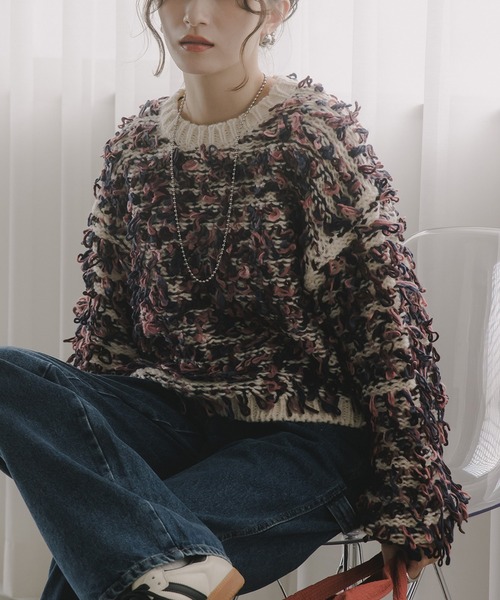 【カールのあるループヤーンにカラー配色で編まれたデザインニット】 カーリーなループヤーンの編地がかわいいデザインニット。 絶妙な配色でこなれ感を演出してくれる一着です。 たっぷりとした身巾と程よいクロップド丈のバランスが◎ やわらかな肌触りで着心地も抜群です。 ゆったりしたサイズ感のオーバーサイズニットで ストレスなく楽に着用していただけます。 【素材】 やわらかく肌触りのよいニット ------------ 裏地 なし 透け感 なし 伸縮性 あり 光沢 なし ポケット なし 洗濯方法 手洗い可 ------------ 【インフォメーション】▼商品のお気に入り登録 完売カラーの再入荷通知を受け取ることができます。ぜひご登録ください★ ▼ブランドのお気に入り登録 新商品や再入荷などのお得情報を受け取ることができます。ぜひご登録ください♪