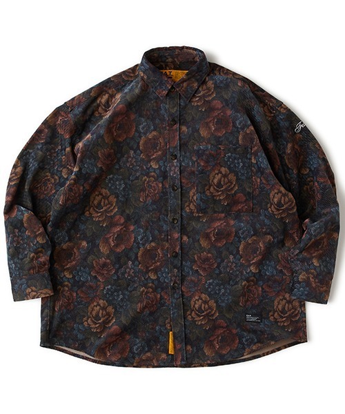 落ち着いたカラーリングのボタニカルプリントを施したコーデュロイ素材が印象的なBIGシルエットシャツ。通常よりも身幅・肩幅にゆとりをもたせ、ルーズになりすぎないレングスや袖まわりはボリュームのあるボトムスを合わせていつもとは違うカジュアルコーディネートを楽しみたい。スウェットの上からライトアウター感覚でざっくり羽織るのも面白い。袖のロゴ刺繍や裾のネームも程よいアクセントに。