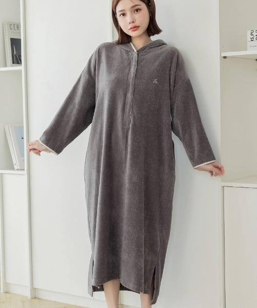 tu-hacci Outbath Collection ワンピース単品 濡れた肌でも3秒でサッと着られる!湯上がりワンピース お風呂上がりのバタバタ、こんな経験ありませんか? ・すぐに子どものお世話をしたい ・湯上がりに体が冷えやすい ・スキンケアやヘアケアをすぐに済ませたい そんな声に寄り添い、毎日をより快適に過ごせる湯上がりワンピースを開発。 高吸水タオル生地が濡れた体をやさしく包み込み、 お風呂上がりを、もっと快適に、もっと自由に。 ■こんな時におすすめ ・ワンオペ育児のお風呂上がりに、サッと着替えたい ・快適な着心地が続くので、ジムや温泉での着替えに ・秋冬のルームウェアに ・前を大きく開けるので授乳服としても 【商品の特徴】 ・裏地は汗や水滴を素早く吸収する高吸水タオル生地 ・表地はベロア調素材でリュクスな印象に ・フード付きで髪の水滴もスマートにカバー ・肌当たりの良い綿100%素材 ・片手で留められるスナップボタン×大きく開く前開き設計で赤ちゃんを抱っこしたままの授乳もスムーズに ・スマホも入るポケット付き ・スリット入りの裾で動きやすさも◎ ■平置き実寸 着丈:約116cm 幅:約65cm ※サイズはスタッフが平置きで採寸した実寸値となります。 多少の誤差が生じる場合がございますので、予めご了承いただけますよう、お願い申し上げます。 ■素材 綿100% ※柔らかい風合いを重視しているため、繊細な生地となっております。爪やアクセサリーで引っかからないよう、ご注意ください。