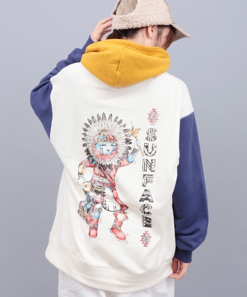 個性が光る☆サンフェイスバックプリントのプルパーカー ■デザイン 『カッチーナ』と呼ばれる、ネイティブアメリカンのホピ族が信仰する精霊を背中に大胆にプリント! 全ての命の源として人気の『サンフェイス』をかすれたビンテージ風にアレンジすることで、風合いと落ち着き感をプラスしました。 程よいルーズ感のある、ベーシックなストレートシルエットで着回ししやすいのがポイント。 男女兼用で着られるので、ご家族やカップルでお揃いにして楽しむことができます。 ■サイズ感 フリーサイズ 程よくゆったりと着られるサイズ感でユニセックスで着られます。 ヒップがすっぽりと隠れる長めの丈感です。 ■素材感 柔らかな裏毛スウェット素材を使用。 ロングシーズン着用できる、軽やかで快適な着心地です。 ■スタイリング ワイドパンツやカーゴパンツと合わせればストリート感のあるカジュアルコーデに。 キャップやニット帽をプラスしてスポーティーな雰囲気を楽しむのもおすすめです◎ ■カラー チャコールグレー/ミックス/マスタード ■お手入れ 洗濯機可 --------------------------------- 透け感:透けない 伸縮性:あり 裏地 :なし 光沢 :なし 生地の厚さ:普通 ポケット:あり --------------------------------- 【TITICACAのお買いものをお楽しみいただくために!】 ▼商品のお気に入り登録 完売カラーの再入荷通知や、ラスト1点の通知、セールの通知も受け取ることができます。 ▼ブランドのお気に入り登録 新商品や再入荷など、いち早くブランドのお得な情報を受けることができます!