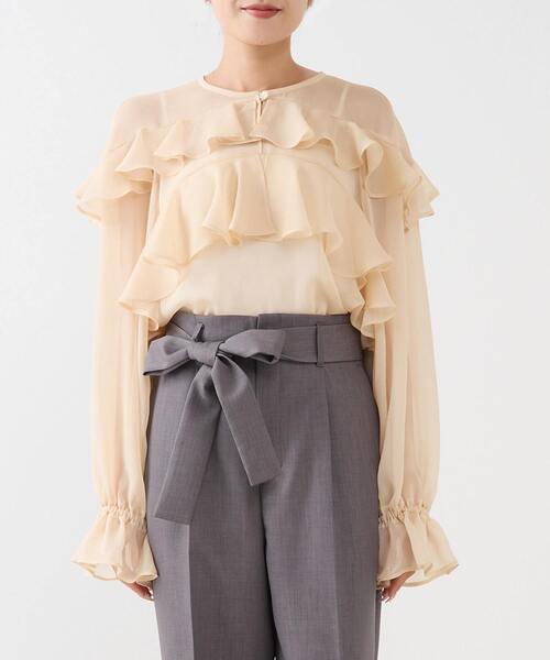 一枚でも華やかなラッフルフリルをあしらったデザインブラウスです。 インナーレイヤードする際は フロントボタンを外してスキッパー風に着用するのもお勧めです。 細番手の強撚糸を使用しているのでシルクライクの様なシャリ感と サラッと落ち感のあるドライタッチなジョーゼット生地です。 薄手で軽く透け感のある素材です。 ■透け感 ややあり ■伸縮性 なし ■光沢感 なし ■裏地 なし ■生地の厚さ 薄い