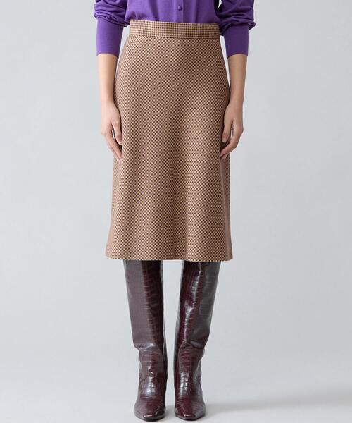 深まる秋に似合うこっくりとしたメランジカラーのイタリア糸を 使用したハウンドトゥースツイードで仕立てたバイアススカート。 膝丈のAラインが新鮮なバランスです。 ツィードのカラーとリンクする、 プレイフルなカラーニットとあわせたグッドガールな着こなしがおすすめ。 ■透け感 なし ■伸縮性 なし ■光沢感 なし ■裏地 総裏 ■生地の厚さ やや厚い