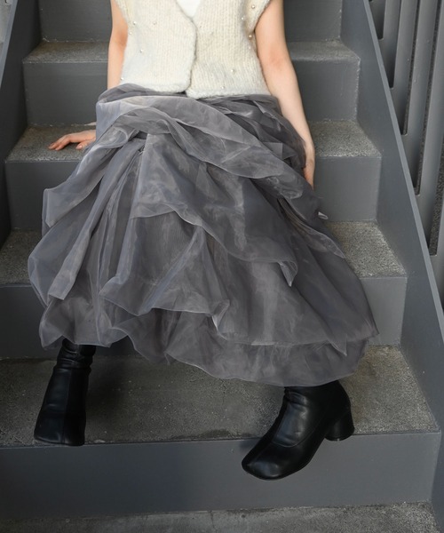 【デザインポイント】 ・オーガンジー素材をランダムに重ねたスカート ・折り返し仕様と一枚仕立てのティアードを アシンメトリーに施しボリューム感を ・微配色の裏地を入れてキャッチーに 【スタイリングポイント】 ・軽やかなオーガンジー素材が、 歩くたびにふわっと揺れてフェミニンな印象に ・贅沢に生地を使用したティアードデザインが 立体感を生み、華やかさと存在感をプラス ・オーバーシルエットのトップスや ジャケットやレザー小物と合わせることで 甘くなりすぎず大人っぽいスタイリングが完成します ※サンプルの為、仕様が異なります。 <サンプルからの変更点> ・バルーン仕立てのティアードは、折り返し仕様に変更になります。 透け感 (表地)あり(裏地)なし 伸縮性 なし 裏地 あり ウエストゴム (後全面)あり ファスナー なし ポケット なし アジャスター なし 繊細な素材の為、強度な力が加わると縫い目が開いたり 滑脱の原因になる可能性がございますのでご注意ください。 ・手洗い ・日陰の吊り干し ・タンブラー乾燥禁止 オーガンジー ランダム ティアード パターン スカート