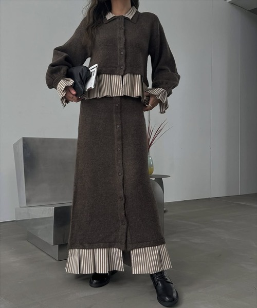 【デザインポイント】・トライプ柄の布帛をドッキングした、前開きデザインのニットスカート・裾のストライプ部分にはプリーツ加工を施し、動きのある仕上がりに・前開き裾はボタンを開けてスリットにすることも【スタイリングポイント】・shirt docking pleats frill cuffs knit CDと セットアップでご着用いただけます・裾から覗くシャツ地がレイヤード感を演出し 1枚でこなれたスタイリングにアップデート・ニットの柔らかさに かっちり感のあるストライプシャツとの異素材コンビが メリハリのあるスタイリングに・フロントボタンを開け、抜け感をプラスし ブーツなどを見せたスタイリングもオススメ※サンプルの為、仕様が異なります。<サンプルからの変更点>・ウエストが4cm小さくなります。透け感 なし伸縮性 (本体)あり (別布)なし裏地 なしポケット ありアジャスター なし素材の性質上、引っ掛け、引っ掛かりが起きやすいので、お取り扱いにご注意ください。繊細な素材の為、強度な力が加わると縫い目が開いたり滑脱の原因になる可能性がございますのでご注意ください。こちらの製品は編地の都合上、製品自体の重さで伸びることがあります。シルエットを崩さないために、たたみ保管にしてください。・家庭用洗濯禁止・クリーニング・タンブラー乾燥禁止プリーツ ドッキング ボタン スリット ペンシル ニット スカート
