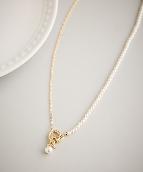 華奢なチェーンと小粒パールの組み合わで顔周りを明るく上品な印象に。【デザイン・シルエット】・半分がチェーン、半分がパールで構成された、トレンド感あふれる異素材ミックスデザイン。・見る角度によって表情が変わり、首元にこなれ感を演出するアシンメトリーな配置。・さりげなく揺れる一粒パールが、女性らしい繊細さと華やかさをプラス。・スライド式アジャスターでお好みの長さに微調整が可能。トップスのネックラインに合わせて最適なバランスを作れる。【カラー】・ゴールドとシルバーの2色展開。【スタイリングポイント】・きれいめのブラウスやリブニットにプラスしてエレガントな印象に。・タートルネックやハイネックニットの上から着けて、縦のラインを強調するアクセントにするのもおすすめ。※撮影時の光、お使いのモニター環境によって色の見え方が違う場合がございます。