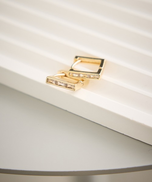 定番のフープピアスを、シャープなスクエア型にアップデート。【デザイン・シルエット】・甘すぎない、エッジの効いたスクエアフォルム。・凛とした直線的なラインが、横顔をスタイリッシュで知的な印象に見せてくれる。・フープの正面には、クリアストーンを贅沢に配置。小ぶりながらも顔周りを明るく華やかに彩る。・耳たぶにフィットするような小ぶりなサイズ感で、普段使いに最適。オフィスシーンでも悪目立ちせず、さりげないお洒落を楽しめる。【カラー】・ゴールドとシルバーの2色展開。【スタイリングポイント】・オフィスやフォーマルシーンで、きちんと感を演出。・シャツやジャケット、セットアップスタイルとの相性は抜群。ミニマルで知的なデザインが、ビジネスシーンにふさわしい洗練された雰囲気をアップ。・ハイゲージのタートルネックニットや、シンプルな無地のカットソーに合わせるだけで、いつものコーディネートがぐっと都会的な印象に。※撮影時の光、お使いのモニター環境によって色の見え方が違う場合がございます。