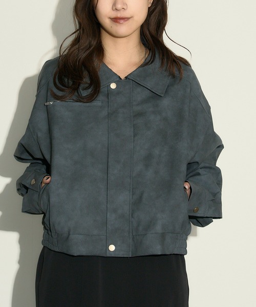 マットな質感とまだらカラーが映える 程よくルーズなドロップショルダーと、短め丈のバランスが今の気分。 マットな質感のレザーライクな生地が、上品さと抜け感を両立します。 ほんのりムラのあるまだらカラーが、奥行きのあるニュアンスをプラス。 シンプルに羽織るだけで、スタイリングにさりげないモード感を与えてくれます。 軽くやわらかな素材で着心地も快適。 デニムやスラックス、ワンピースとも好相性で、 大人フェミニンにもカジュアルにも馴染む一着です。 ▶素材 ・合成皮革 - - - - - - - - - - - - - - - - - - - - - - - - - - - - 【ご注文の際のご注意】 ・当商品は海外生産の製品となり、プリントや糸始末などが甘い部分、若干の傷や汚れ、ほつれ等がある場合がございます。 ・撮影はサンプル品を使用しており、表示のサイズ感も実物とは若干異なる場合もございますので、予めご了承ください。 ・照明やモニターの写り具合により、画像と実際の商品の色が多少違って見える場合がございます。 ・生産時期によってジップ/ボタン等パーツ部品の仕様が異なる場合がございます。 以上、ご了承の上ご購入をお願い申し上げます。 - - - - - - - - - - - - - - - - - - - - - - - - - - - - 【気になったら是非お気に入り登録を忘れずに!】 完売カラーの再入荷や、ラスト1点の通知、セールのお知らせも受け取ることができます。