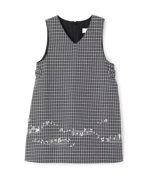 細かいトラッドチェックが、シックな印象のフレアワンピースです。Vラインの衿ぐりと脇のリボンモチーフがデザインポイント。裾の五線譜と音符の刺しゅうも、そこにやわらかい印象をプラス、五線譜の上で音楽を楽しむ子猫たちのシルエットが、さりげない遊び心を添えています。
