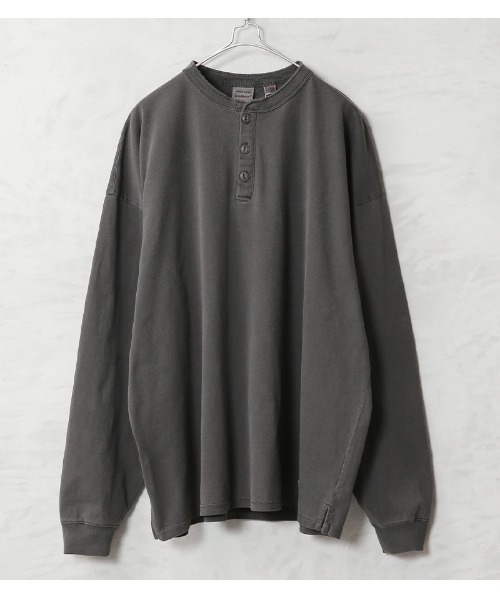 Goodwear グッドウェア USAコットン ガーメントダイ L/S ヘンリーネック Tシャツ SUPER BIGのご紹介です。品番:2W7-65208Goodwear グッドウェアより、ガーメントダイ(製品染め)を施した、ヘンリーネックTシャツの登場です。生地には、タフで肉厚の7.6オンスUSAヘビーコットンを使用。しっかりとタフな生地感でありながら、洗い加工を施しているので、柔らかく、快適に着用可能です。ゆったりとした身幅で、トレンド感のあるオーバーサイズシルエットで1枚でも抜け感のある着こなしが可能です。シンプルな猫目ボタンのヘンリーネックデザイン。襟はリブ仕様で、サイドにはスリットが入っており丈夫で動きやすい仕様です。縫い上げた後に染色を施す 製品染め(ガーメントダイ) を採用し、まるで長く着込んだような 深みのある色合いと独特のムラ感 を表現した一枚となっております。 またドライ感とコシがあるのが特徴で使い込み、洗いを重ねることでヴィンテージ感の風合いを楽しめるのも嬉しいポイントです。着た瞬間から、まるで長年着込んだようなこなれ感と製品染めならではの柔らかな色合い、風合いを楽しめることができるオススメの一枚です。