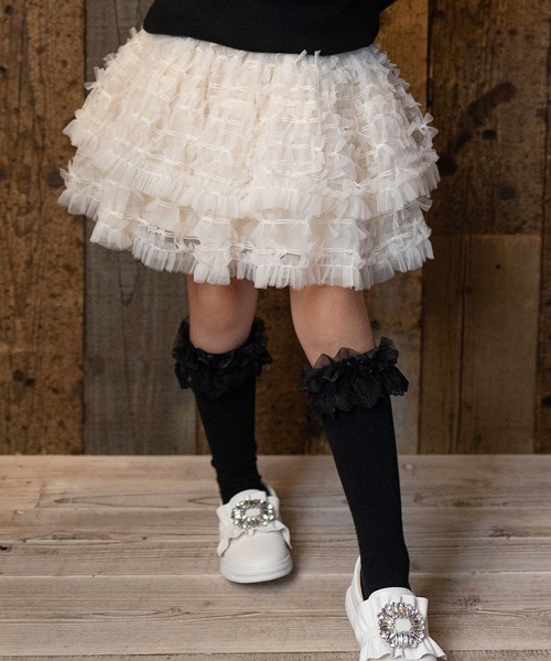 ■商品説明 小さなリボンを形どったレースが フリフリとかわいいスカート♪ フワっと広がるシルエットが特徴で、 動くたびに優雅に揺れ、まるでお姫様のような気分に♪ どんなコーディネートにも華やかさを加えてくれます。 ウエストゴムで履きやすく、 エレガントながらリラックスして着用できます。 特別なお出かけやパーティーシーンにもぴったり♪ 着るだけでおしゃれな雰囲気が漂います。 ちょっとした特別感を加えたい時にぴったりなアイテムです! ■素材 本体:綿84% ポリエステル16% チュール生地:ポリエステル100% ■モデルサイズ 身長107.5cm 体重16.5kg ■モデルの着用サイズ 110cm
