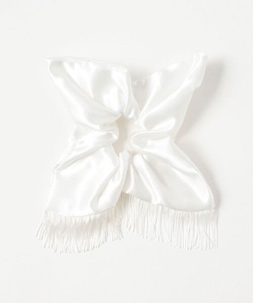 旬なヘアスタイルに決まる■デザイン上品な艶感を持つサテン素材に、フリンジを組み合わせたシュシュ。リボンのような大きなフォルムと、動くたびに揺れるフリンジが、ヘアスタイルに華やかなボリュームをプラスします。■コーディネートシンプルなポニーテールやまとめ髪にプラスするだけで、ぐっと洗練された印象に。手首につけてアクセサリーとしても楽しめます。■サイズ存在感のある大きなサイズ。■素材光沢があり、なめらかな肌触りのサテン素材を使用しています。※光の当たり具合やパソコンなどの閲覧環境によって、実際の色味と異なって見える場合がございます。予めご了承ください。※商品の色味は商品単体で撮影した画像をご参照ください。