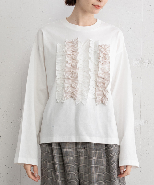■Pointフロントのフリルデザインに遊び心を感じるキャッチーな長袖プルオーバー。ドビーやストライプなど異素材のフリルをミックスしランダムに縫い付けました。ベースは程よいサイズ感で今年らしいバランスで着こなせるルーズなシルエット。袖口もまくりやすいようにストレートな袖にしています。--------------------透け感:ややあり(オフホワイト)厚さ:普通伸縮性:ややあり--------------------◆注意事項◆可能な限り実物に近いカラーにて掲載しておりますが、ご使用のパソコンやスマートフォンなどの端末の環境によって、実際の色味と異なって見える場合がございます。予めご了承ください。サンプルで撮影している商品もございます。その場合、実際の商品とは色味・仕様が異なる場合がございますので、予めご了承ください。POU DOU DOU プードゥドゥひと手間加えた存在感のある「日常着」いつまでもときめきとかわいいを忘れない方への愛着を持てるワードローブ= お気に入り登録がおすすめ!=お得な情報をいち早くお届け致します。アイテムをお気に入り⇒ SALE START / 完売COLOR再入荷 / LAST1点 etc...ブランドをお気に入り⇒新商品 / 再入荷 /クーポン・セール情報 etc...
