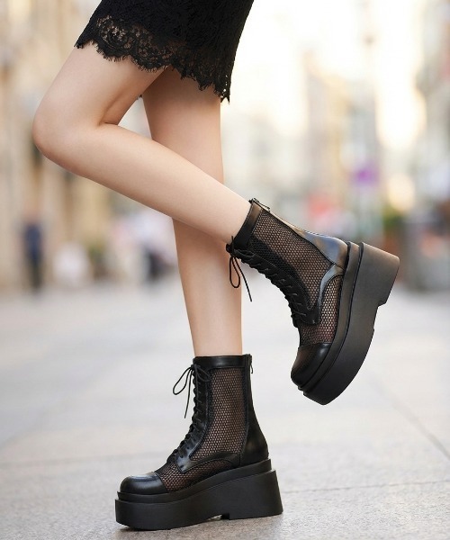 盛れる&歩けるの両立を目指した、美脚効果抜群の厚底ブーツ。透け感のあるメッシュ生地に部分切り替えされたデザインは、抜け感&こなれ感をプラスしてくれるだけでなく、ソックスやカラータイツとの合わせ相性◎メッシュ越しに色を覗かせたカラーコーデでアレンジの幅が広がります。ボリュームたっぷりの存在感でモードな雰囲気を演出しつつ、脚長に加えて華奢見え&細見え効果も◎夏から冬まで通年で履き回せる優秀万能シューズです。