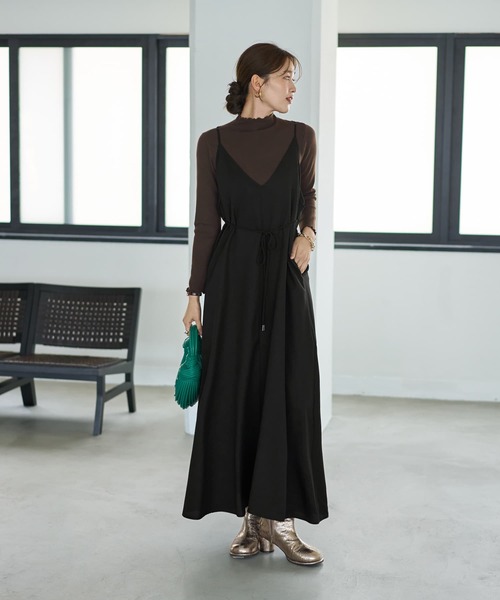 V字ジャンスカでウエストマークが新しい 紐のアレンジも丈感調節も可能で便利な、 ご支持が厚いジョーゼット生地ジャンスカ ◆フロントの美しいV字開きが印象的な、ジョーゼット生地のジャンパースカート。ボディの内側に紐を通してあり、お好みでウエストマークをする/背面で結ぶ/紐を取り外すという3パターンのセレクトができます。 ◆肩紐は長さの調節が自在に可能で、背面の中央で寄せたデザイン。こうすることで肩紐に内側方向の力がかかり、肩紐がズリ落ちにくくなります。 ◆ウエストからなだらかなラインで広がる、スカートのフォルムもキレイでこだわりのポイント。タックやギャザーの無いスッキリとしたデザインですが、生地量により自然なドレープが生まれます。 ◆生地は扱いやすさが人気のジョーゼットを使用。サラサラと薄手で軽く、落ち感に優れた着心地の良い生地です。 ◆中に合わせるものはカットソーや薄手のニットなどがお薦め。ジャンパースカートの生地がブラウス系なので、生地の質感を離すのがカッコよくキメる秘訣です。その上からシャツを羽織ったり、ニットガウンなどを合わせても素敵です。 ◆雰囲気的にはキレイめ感やスタイリッシュさを持ちつつ、気取りの無いラフさや僅かな可愛さも入ったニュートラルなデザイン。クール過ぎない感じや甘さが無いところなど、クセを外した使いやすいデザインになっています。 ◆気分に合わせて思いきり長いマキシ丈で着たり、丈を短めにして軽快なバランスを楽しんだりと、調節のきくところが便利。ヒール付きのブーツを履く日とスニーカーを履く日で丈感を変えるなど、靴に合わせて長さを変えたりもできる使い勝手の良さが自慢です。 ◆季節感:とくに季節を問う生地ではなく、年間を通しての使用が可能。中に合わせるインナーやアウターを変えながら、気温に応じた着こなしを楽しめます。 ◆暖かさ:とくに暖かさは無く、素脚で着るベストシーズンは秋・春という感じ。冬は厚地タイツやレギンスを合わせたり、上からヒップが隠れるニットガウンなどで防寒対策をして着る感じです。 ◆紐の構造:ボディの左右側面に紐サイズの小さな穴が開いており、紐をワンピースの前面裏側に通して、その穴から紐を出して使用します。紐はその穴から完全に抜くことができ、また通すことも可能です。 ◆紐のデザイン:パーカーの首元から垂れているような、丸形断面の編み紐を使用。ここにさりげなくカジュアル感を入れることで、スニーカーやロゴT合わせなどもカワイイ雰囲気的な振り幅が生まれます。紐の先端エンドパーツはブラックメッキ金具。アクセサリーや小物の金具の色を選ばず便利です。 ◆裏地:肩凝りに負担をかけない軽量な造りにしたかったため、裏地は付けずに軽やかに仕上げました。一枚でもキレイに着れるサラサラと肌離れの良い生地ですが、お好みでペチコート類を入れるのも良いと思います。 ◆シワ:シワができやすい生地ではなく、アイロン掛けは不要です。もしも気になる場合はアイロンよりもスチーマーの方が向いており、ササッと伸ばすことができます。 ◆静電気:その方の帯電体質具合や合わせアイテムなどに左右されますが、冬場は乾燥もありますので、もしも気になる場合は静電気防止スプレー等でご対処ください。ペチコート類を入れるのも脚へのはり付き防止に有効です。 【その他の仕様】 ◆着用時期:通年(12-2月の真冬はお好みによる) ◆サイズ感:ゆったりめのサイズ感 ◆丈感:くるぶし程度の丈感 ◆シルエット:Aライン(フレア) ◆肩幅:問わないタイプ ◆アームホール:広い ◆厚み:やや薄手 ◆柔らかさ:しなやかさの中に僅かなハリ感が共存 ◆肌触り:サラサラとしてスムースな感じ ◆着用ジワ:できにくい ◆毛羽立ち:できにくい ◆伸縮性:なし ◆光沢感:なし ◆透け感:少しあり ◆スリット:なし ◆ボタンやファスナー:なし ◆ポケット:両サイドにあり ◆裏地:なし ◆手洗い:可能 ◆裾上げ:お直しに出していただけます ◆アイロン:不要 ◆スチーマー:使用OK 【お色について】 ◆ブラック:通常の定番的なブラックです。 ◆コバルトブルー:ネイビーを明るくしたような、またはロイヤルブルーの彩度をどんどん落として明度を下げたようか、落ち着きのあるブルー。深みはありつつ暗くはない、品のあるブルーです。デニム系の色ではありません。