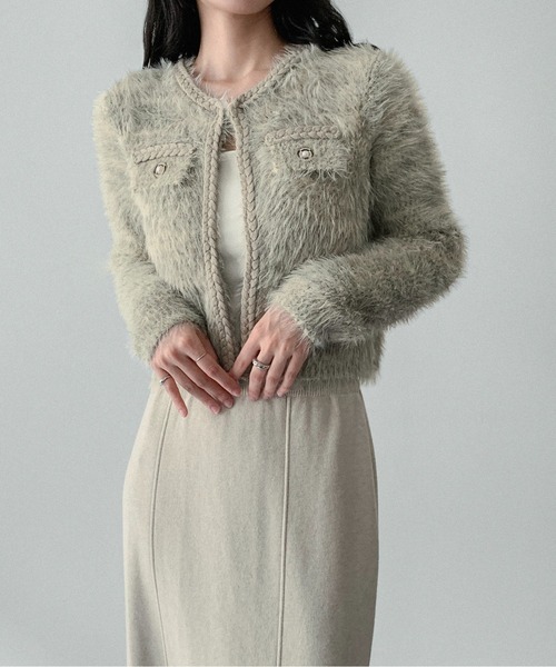 【on:nue】シャギーパールボタンニットジャケットSHAGGY PEARL BUTTON KNIT JACKET■Pointふわふわのフェイクファーが主役級の存在感着回ししやすいシンプルな半袖デザイン短め丈でスタイルアップ効果も軽くてストレスフリーな着心地■Design程よく毛足の長いシャギー素材を使い、ふんわりとした質感と見た目のボリューム感を大切に仕上げたジャケットです。クロップド丈で体に程よくフィットするシルエットが、すっきりと洗練された印象を与えます。華やかなパールボタンが女性らしさを引き出し、シンプルながら存在感のあるデザインに。軽やかで暖かい着心地で、秋冬の様々なスタイルに馴染みます。■Stylingワイドパンツと合わせて抜け感のある大人カジュアルスタイルに。タイトスカートと合わせると女性らしい柔らかな印象を作れます。シンプルなインナーに羽織れば、デイリーにもお出かけにも活躍するスタイルが完成します。■Detail透け感:なし伸縮性:あり光沢感:なし生地の厚み:普通ポケット:なし裏地:なし*ご覧のモニター環境や撮影環境に応じて実際商品の色と異なって見える場合がございますので、ご了承下さい。*素材の特性を考慮して管理法留意事項を購入/着用する場合は必ず確認お願いします。※取り扱い上のご注意商品の特性上、シルエットを保つため、保管の際はハンガーではなく、たたみ保管にしてください。伸縮性のある素材を使用しております為、一点一点多少大きさが異なります。 ※素材の性質上、染料のにおいが多少感じられる場合がございます。数日のご使用や陰干しなどで気になる匂いはほとんど感じられなくなりますので、お試しください。※生地の性質上、着用を重ねますと丈が伸びる可能性がございますのでご了承ください。【 on:nue 】「年を重ねてもおしゃれを楽しみたい大人の女性へ、抜け感のある韓国モードをさりげなく取り入れた上質で長く着られる服」 をコンセプトに韓国大人女子コーデが叶うアイテムをお届けするby muni:rの姉妹ブランドです。■商品お気に入り登録[お気に入り登録] を押すと登録完了!お好きなアイテムとサイズのカラーを登録すると再入荷、販売のお知らせ等を受け取れます。■ブランドお気に入り登録新商品/お買い得情報/クーポン等の通知をいち早く受け取れます。ブランドの最新情報はinstagram[@onnue_official]でご確認頂けます。*注文履歴ページよりご注文頂いた商品の配送時間を確認できます。*他のキャンペーンにより、価格が変わる場合があります。