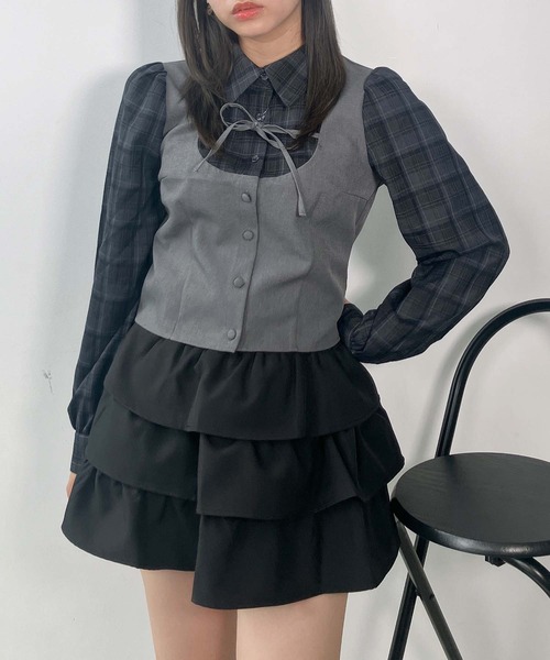 【2026年春夏新色追加】ベストにチェックのブラウスをドッキングした、レディライクなアイテムが登場リボンのついたベストと、これからの季節にピッタリなチェックブラウスを重ねたトレンドアイテム!!落ち着いたカラーだから甘すぎず、大人っぽい印象に♪程よいコンパクトサイズだから、華奢見え効果も期待できちゃいます!とことんガーリーにミニスカートと合わせるのがおすすめです◎セットアップ対応品番▼○デザインティアードリボンミニスカート(品番:QE0640-2)▼商品について・画像の商品はサンプルとなります。実際の商品と色味、仕様、加工、サイズ、素材等が若干異なる場合がございます。・サイト上のカラー名と、お届け商品に記載されているカラー名が異なる場合がございます。・商品の色味は、撮影場所や光のあたり具合などにより色味が違って見える場合がございます 。また、お客様のお使いのPCのモニター環境などにより色味が違って見える場合がございます。予めご了承の上ご注文下さい。▼お取り扱いについて・着用またはお取り扱いの際は、アテンションタグや洗濯ネームを必ずご確認ください。▼返品・キャンセルについて・着用、洗濯後の返品は致しかねます。・商品到着後、着用前に商品を確認して頂きますようお願い致します。♪商品のお気に入り登録お気に入り登録した商品は、ラスト1点になった時、完売商品の再入荷、セールになった時にお知らせします。♪ブランドのお気に入り登録新商品の発売、再入荷、セール情報など、ブランドのお得な情報を受け取ることができます。
