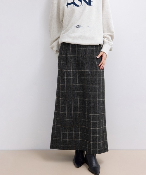 パンツのようなディティールでスタイリッシュに決まる1着。きちんと感がありつつも、こだわりのあるツイード調素材がスタイリングをブラッシュアップしてくれるタイトスカート◆2025-26秋冬◆ ADAM ET ROPE' FEMME 【Material】 ツイード調素材のストレートスカート。 毛羽感のある素材で、3色とも異なる柄と厚みで展開。 ツイードほど重厚感はなく、軽さや柔らかさのある素材。 【Design】 前ファスナー開きとワンタック仕様で、まるでパンツのようなディテールを取り入れた、きちんと感のある総裏スカート。 ベルト下とサイドにはパイピングテープを挟み込み、さりげないライン使いでマニッシュなムードをプラス。 両サイドとバックには片玉縁ポケットを配置し、実用性と上品さを兼ね備えたデザインに。 すっきりとしたストレートシルエットながら、バックにはベンツ入りで動きやすさにも配慮。 【Color】 クラシカルかつインパクトのあるブラックチェック、クラシックで落ち着いた雰囲気のチャコール、上品でナチュラルなダークブラウンの3色展開。 【Styling Point】 ベーシックなタートルネックやロンTと合わせて洗練されたシンプルスタイルに。 スウェットなどのカジュアルアイテムと合わせるも素敵。 --------------- 透け感:なし 裏地:あり 伸縮性:なし 光沢感:なし 生地の厚さ:やや薄手~中肉 開き方:ファスナー ポケット:あり --------------- ◇モデル情報 身長:165cm size:38 【素材】 02:クロサブ (表地)ポリエステル 92% レーヨン 2% アクリル 2% ナイロン 2% 毛 1% コットン 1% (裏地)ポリエステル 100% 06:チャコール (表地)ポリエステル 64% レーヨン 35% ポリウレタン 1% (裏地)ポリエステル 100% 20:ダークブラウン (表地)ポリエステル 72% レーヨン 15% 毛 10% ポリウレタン 3% (裏地)ポリエステル 100%