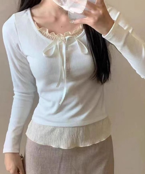 ◆DETAIL◇フリルネックにリボンをあしらった、レイヤード風デザインが可愛いリブトップス♡チュールフリルとサテンリボンの組み合わせが今っぽさ満点です!ヘンリーネックデザインで程よい抜け感を演出し、甘さとカジュアルさを両立。裾にもプリーツフリルを施しているので、アウトスタイルでも腰回りを可愛くカバーし、リブ素材でボディラインに優しくフィットし、スタイルアップ効果も期待できます。1枚着としてはもちろん、ジャケットやカーディガンのインナーとしても映える万能アイテム。◆COORDINATE◇①【ガーリーコーデ】プリーツスカートとロングブーツで甘めに仕上げて、リボンを主役に。②【カジュアルコーデ】デニムパンツに合わせて、ラフに着こなしつつフリルで華やかさをプラス。③【フェミニンコーデ】タイトスカートと合わせて、きれいめなお出かけコーデに。アウターを羽織ってもリボンが映えます。◆POINT◇・フリルネック×リボンでフェミニンな印象・レイヤード風デザインで1枚で着映えする・リブ素材でフィット感がありスタイルアップ・カジュアルにもフェミニンにも着回し可能・インナーとしても主役トップスとしても活躍◆着用レビュー◇【スタッフA:身長155cm 骨格ストレート】Mサイズ着用。程よいフィット感で窮屈さはなし。インしてももたつかず、スカート合わせが可愛く決まりました!上半身のフィット感を活かし、かっちりとした素材のボトムスでバランスを取ると、着痩せして見え、オフィスにも対応できるきれいめな着こなしになります♡首元が広めのラウンドネックなので、首が詰まって見えずスッキリした印象でリブの縦ラインが肉感を拾いすぎず、Iラインを強調してくれました!【スタッフB:身長160cm 骨格ウェーブ】Lサイズ着用。体に沿うシルエットでスタイル良く見える。ジャケットの中に着てもリボンが映えるので冬のインナーに◎。華奢で小ぶりなデザインのネックレスやピアス。パールやビジューなど、キラキラした素材で華やかさをプラス。ふんわりとした素材や曲線的なデザインのスカートと合わせると、ウェーブタイプの持つ曲線美が際立ちます。ハイウエストで重心を上げるのもおすすめです♡◆キーワード◇・フリルカットソー ・リボンデザイン ・バレエコア ・フレンチガーリー ・リブニット・大人可愛い ・デコルテ見せ ・リブトップス・フリルリボン・レイヤード風・ガーリー・フェミニン・カジュアル・インナートップス・春服※着用身長によって画像イメージと異なる場合があります。※撮影環境により、実際のカラー、形状、デザイン等多少異なる場合がございます。 《 お知らせ 》▼商品のお気に入り登録 お気に入りアイテムの値下げ・再入荷・在庫1点などの通知を受け取ることができます。▼ブランドのお気に入り登録 新商品や再入荷、セール、クーポン配布などお得な情報を受け取ることができます。 是非、お気に入り登録してみてください♪