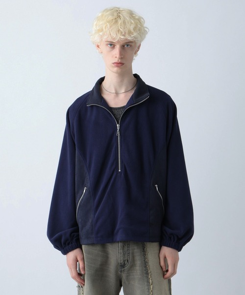 ーーー スウェード生地で切り替えモードに昇華した、ZIPがアクセントになるフリースの登場 ーーー DESIGN 身頃のサイドを上品なスウェード生地で切り替えたデザインで、他のフリースとは差別化できます。 首元のZIPを深めに設定しており、開閉具合によってインナーの見え方が変わるためレイヤードスタイルを楽しめます。 無駄な装飾を省き、ボディのZIPがアクセントになるミニマルなデザインのため洗練された雰囲気に。 ゆったりとしたシルエットでリラックス感がありながら、着丈は長すぎない設定ためルーズな印象にならず綺麗に着用出来ます。 MATERIAL 目の細かいフリースを使用しており、カジュアルからきれい目まで幅広いスタイリングに取り入れやすい一枚に。 軽やかで肌触りの柔らかい生地感のためストレスフリーに着用できます。