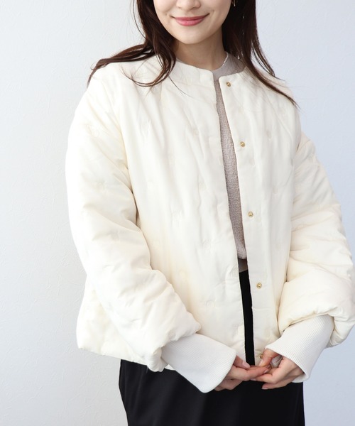 ドット刺繍キルティングノーカラージャケット 立体感のあるドット刺繍が印象的な、女性らしいキルティングノーカラージャケット。 ほどよいボリューム感と軽さが魅力で、羽織るだけでシーズンムードを高めてくれます。 すっきりとしたノーカラーデザインで、マフラーやフード付きインナーとのレイヤードも楽しめる一枚です。 ■おすすめポイント 表面に施されたドット刺繍が上品でやわらかな印象 軽量ながらもあたたかく、デイリーに活躍 ノーカラー仕様で顔まわりをすっきり見せるデザイン 程よく短めの丈感で、ワイドパンツやスカートとも好相性 ■おすすめコーディネート デニムに合わせて、カジュアルに抜け感をプラス ロングスカートやワンピースに羽織って、女性らしいバランスに タートルニットやブラウスをインすれば、オンにもオフにも対応可能 -------------------------------------- 透け感:なし 裏地:あり 伸縮性:なし ケア方法:ドライクリーニング ※お洗濯の際は洗濯表示を必ずご確認ください。 -------------------------------------- 同素材コート:80701602