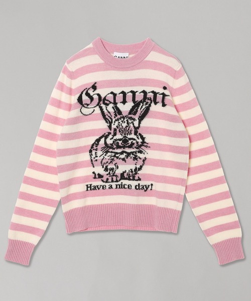 GANNI 2025 AW Collection ―Detail― ・ストライプ柄に愛らしいうさぎのグラフィックを組み合わせたクルーネックニット。 ・リラックス感のあるボックスシルエット。 ・デニムなどシンプルなアイテムとの合わせでもサマになる主役級アイテム。 ―Fabric― ・ウール混素材で、暖かさと軽やかさを両立した仕上がり。 ・チクつきにくい風合いで、素肌にもやさしい着心地。 透け感:なし 裏地:なし 伸縮性:あり 光沢感:なし 生地の厚さ:中厚 ポケット:なし <GANNI|ガニー> コペンハーゲン発のファッションブランド。 パターンを組み合わせたエフォートレスで手に届きやすい遊び心のある服を発表しており、SNSやストリートで今人気を集めています。