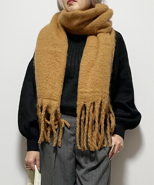 ◆ふわふわ、もっちり、やわらかマフラー◆ ふんわり肉厚なバルキーストールは太フリンジがデザインポイント♪程よく大判で、首に巻くのはもちろん肩からかけて使うのにもぴったり!ボリュームたっぷりで、見た目も使い心地も暖かいウィンターシーズンのマストアイテムです。