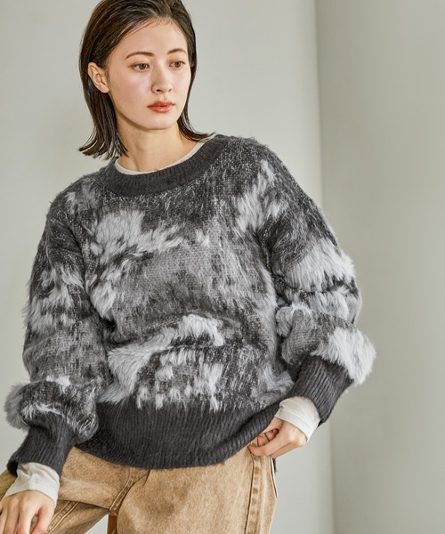 クールな印象を与えるアート風グラデーションが施されたニットトップス。奥行きのある複雑な模様が個性を主張しつつ、落ち着いた色合いで幅広いスタイルにマッチします。1枚でこなれ感が出せる主役級ニットです。【素材】毛足が長めでふんわりとした表面感が特徴のニット。軽量で柔らかな風合いがは保温性が高く温かく、秋冬シーズンにぴったりの素材感です。【スタイリング】インパクトのある柄を活かして、シンプルなボトムスやアウターと合わせるのがおすすめ。デニムやカーゴパンツでカジュアルに仕上げたり、スカートやスラックスできれいめスタイルにまとめても◎。