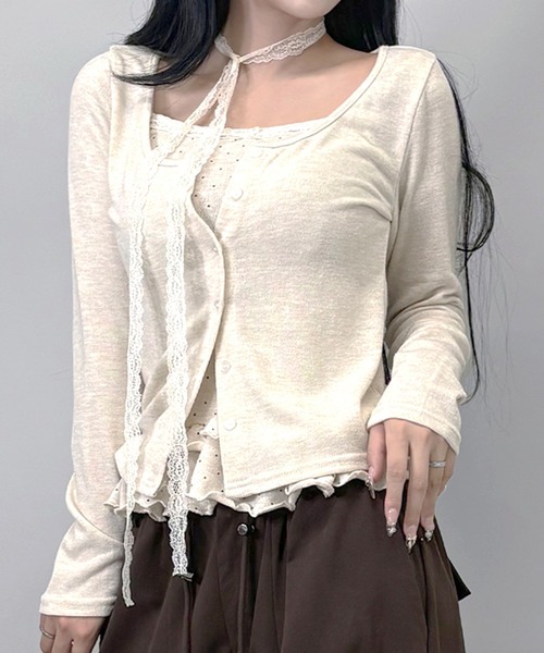 トレンドのY2Kガーリースタイルにぴったりなキャミソール×カーディガンのセットアイテム。 ドット柄キャミソールにはレースとリボンをあしらい、裾のフリルでフェミニンムードを演出。 シンプルな薄手カーディガンを羽織ることで甘さを程よく中和し、大人可愛い雰囲気に。 デニムやカーゴパンツと合わせればストリートライクに、ミニスカートやレースアップブーツと合わせれば王道Y2Kガーリーコーデが完成。 単品使いでも着回し力抜群の万能アイテムです。 ■ カラー アイボリー、ブラック、ベージュ、ダークブラウンの4色展開 【生地感】 -------------------------- 裏地:なし 透け感:なし 生地の伸び:あり 光沢感:なし -------------------------- *ご覧のモニター環境や撮影環境に応じて実際の 商品の色と異なって見える場合がございます。ご了承ください。 *素材の特性を考慮して管理法留意事項を購入/着用する場合は必ずご確認をお願いします。 【商品のお気に入り登録】 お気に入りの商品やサイズ・カラーまで、お気に入りの登録をしていただきますと、 そのアイテムのセールの通知、ラスト1点になった時の通知や、完売しても 再入荷通知を受け取ることができます。 【ブランドのお気に入り登録】 新商品の発売や再入荷、タイムセール情報やクーポン発行のお知らせなど、 FOLLOWINがお届けするお得な情報を受け取ることができます♥ ▶ブランドの最新情報はinstagram【@followin】でご確認いただけます! * 注文履歴ページよりご注文いただいた商品の配送時間を確認できます。 * 他のキャンペーンにより、価格が変わる場合があります。 ※他のキャンペーンにより、期間中に価格が変動する場合があります。 ※セールは予告なく終了させていただく場合もあります。