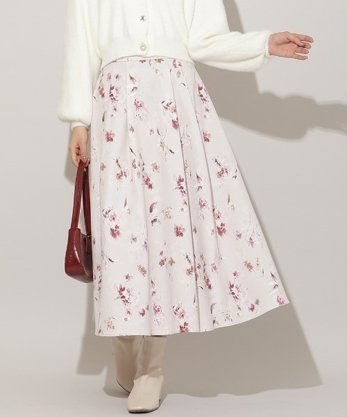 儚げな水彩風フラワープリントのロングフレアスカート 【Design】 ・落ち着きのある水彩風の花柄デザインがコーディネートを彩るタックフレアスカート。 ・WILLSELECTIONで人気のオリジナルプリントの新作アイテムです♪ ・同じパターンを使用した「フラワープリントウエストシャーリングワンピース(品番:20082525100119)」もおすすめです! ・タックを施すことでふんわりと広がるフレアシルエットが魅力のアイテム。 ・ウエストバックはゴム&レースアップデザインでサイズ調整が可能です◎ ・左ファスナー付き。 【Fabric】 ・オリジナルのフラワープリント施した生地を使用。 ・裏地付き。 ・ご自宅でお手入れが出来るのも嬉しいポイント♪ ・ホワイト、ピンク、ブラウンの3色展開となります。 【Care】 手洗い可能 F:(00):着丈85.5cm/ウエスト66~80cm/裾回り267cm/ベルト幅5.5cm
