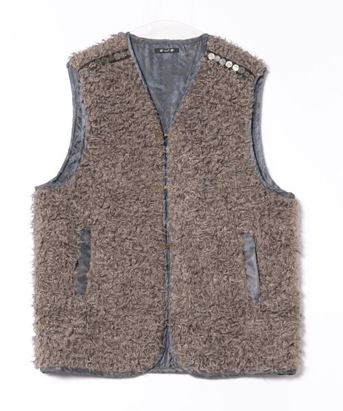 Tibetan Nomad Vestチベットの遊牧民の防寒着をイメージした、さわり心地の良いプードルファー生地のメンズベスト。裏地の艶感のあるペイズリー柄生地と、前開きのメタルホックが高級感を演出。両肩のコインチャーム付きテープがアクセントに。秋冬のフォークロアスタイルにおすすめなアイテム。ユニセックスでご着用いただけます。※こちらの商品は1点1点職人による手作りとなります。その為、形や色合いなど若干異なる場合がございます。あらかじめご了承ください。※屋外での撮影画像は、光の当たり具合で色味・カラーが違って見える場合がございます。商品のカラーは、スタジオ撮影の画像をご参照ください。Amina Collection Co.,LTD.