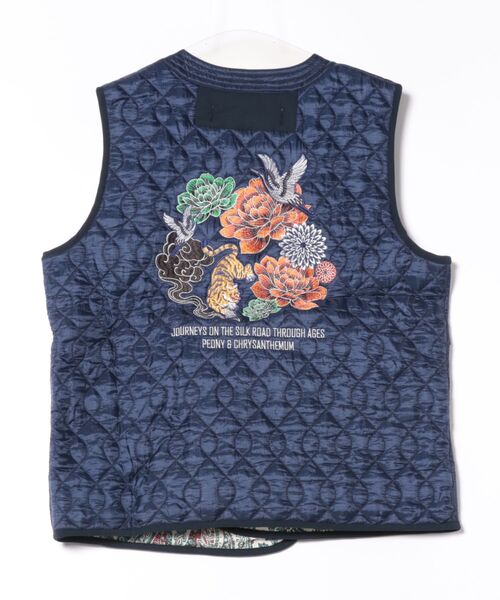 バックスタイルの大胆な刺繍と裏地のペイズリー柄プリントなど、ディテールにこだわったキルティングメンズベスト。オリエンタル、カジュアル、どちらのコーディネートにも合わせやすいデザイン。刺繍にはメタリックな糸も使用、牡丹の花部分はグラデーションで、さらに豪華さを演出しました。柄は中国の国花「牡丹」と日本の国花「菊」、さらに日本の縁起の良い生き物である鶴と中国の威厳の象徴である虎を融合させたもの。シルクロードで出逢う中国のオリエンタルな雰囲気を刺繍で表現しました。着脱しやすいバックル仕様。JOURNEYS ON THE SILK ROAD THROUGH AGES PEONY&CHRYSANTHEMUM『時代を超えたシルクロードの旅 牡丹と菊』※こちらの商品は1点1点職人による手作りとなります。その為、形や色合い・模様など若干異なる場合がございます。あらかじめご了承ください。※屋外での撮影画像は、光の当たり具合で色味・カラーが違って見える場合がございます。商品のカラーは、スタジオ撮影の画像をご参照ください。Amina Collection Co.,LTD.