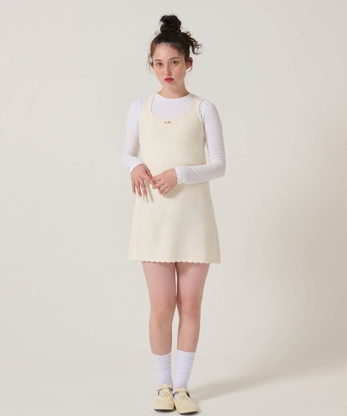 手作業でかぎ針エジングを施したニットジャンスカ。 胸元にサテンの小さなバラを付けたユーロビンテージのような可愛らしい雰囲気をメイク。 p o i n t ・上身頃は天竺裏目、スカート部分は天竺表目で表面感を変えた仕様に ・裏地なしでレイヤードしやすく、デニムやタートルとのスタイリングもおすすめ ・カラー毎に異なる胸元のサテンの小さなバラ ホワイト:ピンク ラベンダー:パープル 透け感/ややあり 伸縮性/あり 裏地/なし 手洗い可, タンブル乾燥不可, 低温アイロン可 <お届け時のシワにつきまして> ページで着用している商品は撮影前に全てプレスをかけております。(バッグ・小物等除く) その為お送りする商品は畳みジワや細かいシワがついている場合がございます。 <色移り・色落ちについてのご注意点> この商品は摩擦(特に湿った状態での摩擦)や汗や雨などでぬれた時は他の衣料や下着に色が移る事がありますので、十分ご注意ください。 <臭いについてのご注意点> 染料や加工を加えた際の臭いが製品に付着している場合がございます。 臭いが気になる場合には、風通しの良い日陰の場所で陰干しをしてください。 <写真・画像・カラーについて> 商品のカラーは撮影環境・視認性を考慮した色調整を行っておりますが、撮影条件やブラウザ、パソコンの環境により、実物と異なる事がございます。また、モデル画像・スナップ画像は撮影条件の影響を大きく受けやすくなっております。商品単体の画像をご参考にしていただくようお願いいたします。 <製品のお取り扱いについて> 取り扱いについては、商品についている品質表示に詳細を記載しております。必ずご確認ください。 <洗濯について> お洗濯は商品についている洗濯絵表示に従って行ってください。