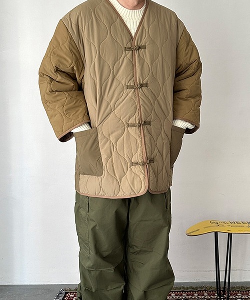 チャイナボタンが印象的な定番型。今期は素材からデザイン、サイジングまでリニュ-アル。 米軍M-65フィッシュテールパーカーのライナーを模したヒョウタン型キルティングを施した軽量なDAN-TENです。 今期はツヤを抑えた素材に変更し身頃、袖などのパーツをクレイジーパターンに組むことで新鮮なイメージに仕上げました。 また、より羽織りやすく、綺麗なシルエットになるように各所のサイジングも変更しアップデートしています。 付属の袋に収納可能なパッカブル仕様で、収納時には枕にも。 持ち運びや自宅での保管時に便利です。 ボタンの数を1つ増やしVゾーンを狭くする事でスッキリした印象の胸元になりました。また、ボタンのサイズもひと回り大きくすることで使いやすくなりました。 前身頃、後身頃、袖、ポケット、ボタンとパートごとに配色されたデザインもポイントです。 【DAN-暖纏:ダンテン】 日本伝統の生活着であるはんてんの形状や特徴を活かし、 今のエッセンスを加えた新たなスタンダードウェア。 ゆったりとした着心地、すっきりとした襟元。 重ね着しても窮屈にならないアールホーム。 作業や家事がしやすい袖丈。 家で過ごす時、外に出る時もさっと羽織れる。 わたしたちの生活に寄り添い いつも心地よくあたためてくれます。
